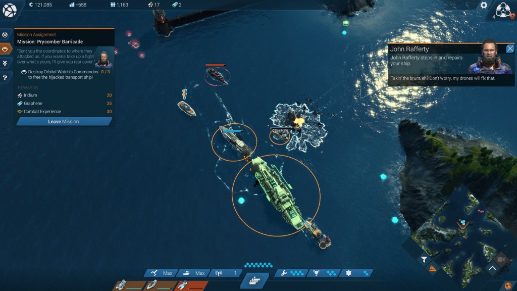 Pero, para sorpresa de algunos, no todo es paz y tranquilidad en este juego de simulación y planificación. Anno 2205, al igual que sus antecesores, nos presenta una serie de misiones de combate integradas prolijamente en el contexto del sereno intercambio comercial predominante. Sí, leíste bien: combate. Ante los ataques de un grupo de resistencia que pretende sabotear nuestros esfuerzos por expandirnos hacia el espacio, comandamos una flota de buques de guerra que controlamos en escenarios de estrategia en tiempo real. Si bien en este modo las unidades no siempre responden con precisión a nuestras órdenes -en especial si comparamos la jugabilidad con aquella de los RTS-, estos breves momentos de acción reflejan una astuta manera de evitar que la simulación económica nos sature. En este apartado militar incluso vamos ganando experiencia, y podemos mejorar nuestra flota para enfrentar desafíos más dificultosos.