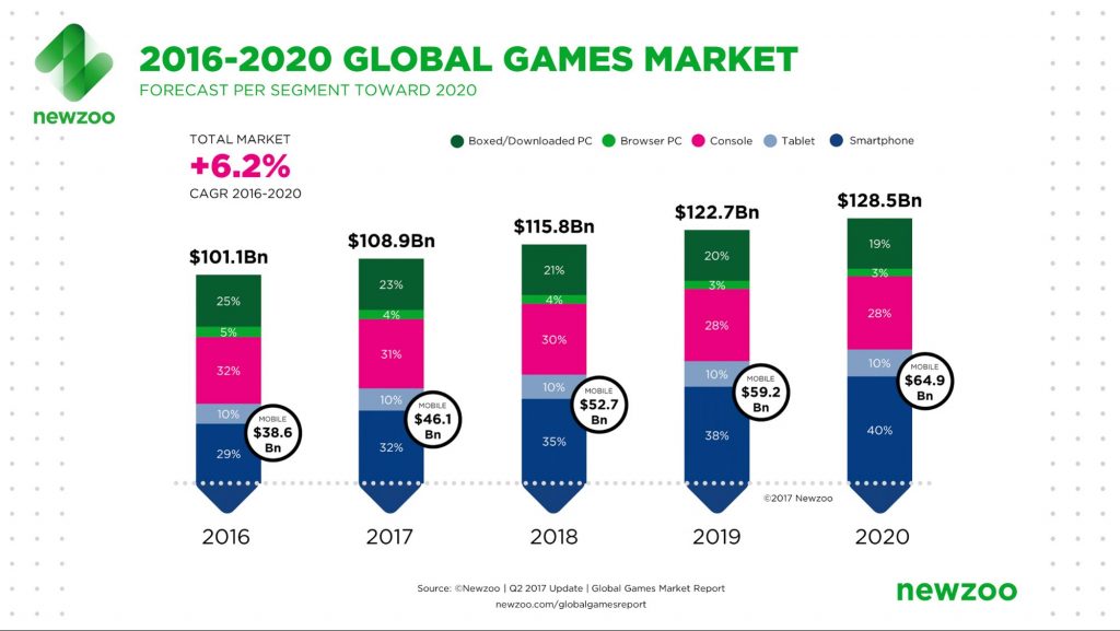 La industria está en su mejor momento, de eso no hay dudas. En los últimos años, la recaudación de la industria del gaming alcanzó valores siderales. Tan espectacular es el boom que ni el crecimiento del producto bruto interno nominal de muchos países se asemeja a los guarismos del gaming: según un informe de la consultora Newzoo, las ventas globales de juegos alcanzaron casi los 100 billones de dólares norteamericanos, un 8.5% por encima del año 2015. De aquí a 2019, el estudio espera un crecimiento del valor de las ventas de 6.2% promedio por año. Es decir que el señor Activision (o Mister Electronic Arts o Monsieur Ubisoft) va a poder seguir tirando manteca al techo.