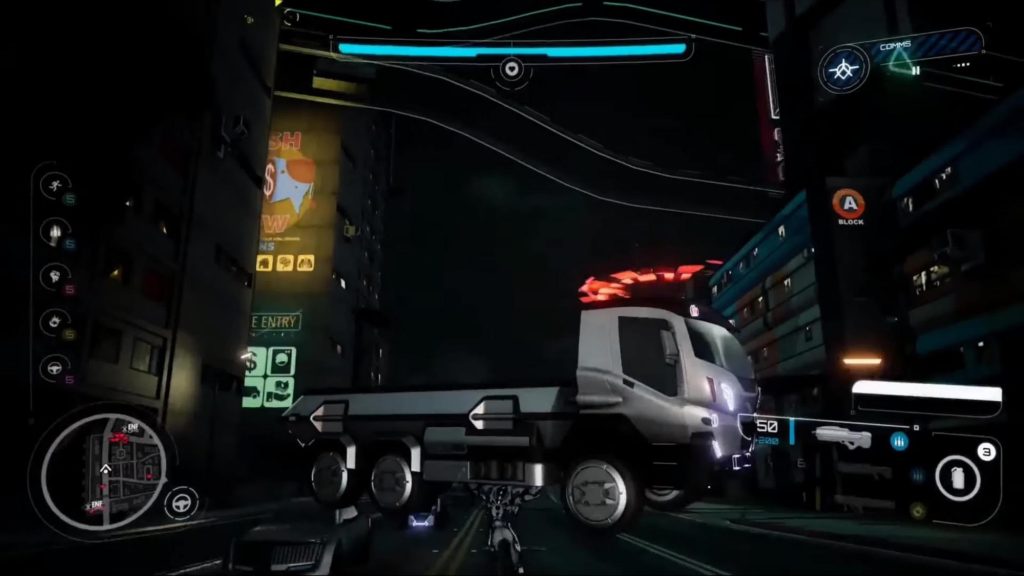 También contamos con la posibilidad de hacernos con vehículos, pero esta opción no sólo resulta completamente intrascendente por lo mal que se manejan, sino que muchos -o los más interesantes o útiles, al menos- de los objetivos a alcanzar se hallan en lugares de difícil acceso, y siempre termina siendo más rápido o cómodo acceder mediante las habilidades de desplazamiento del Agente.