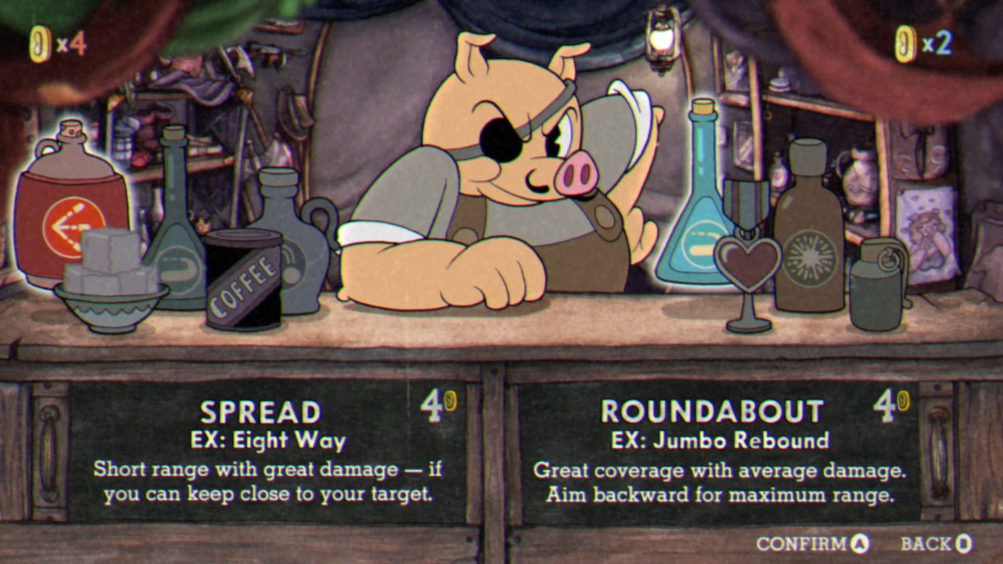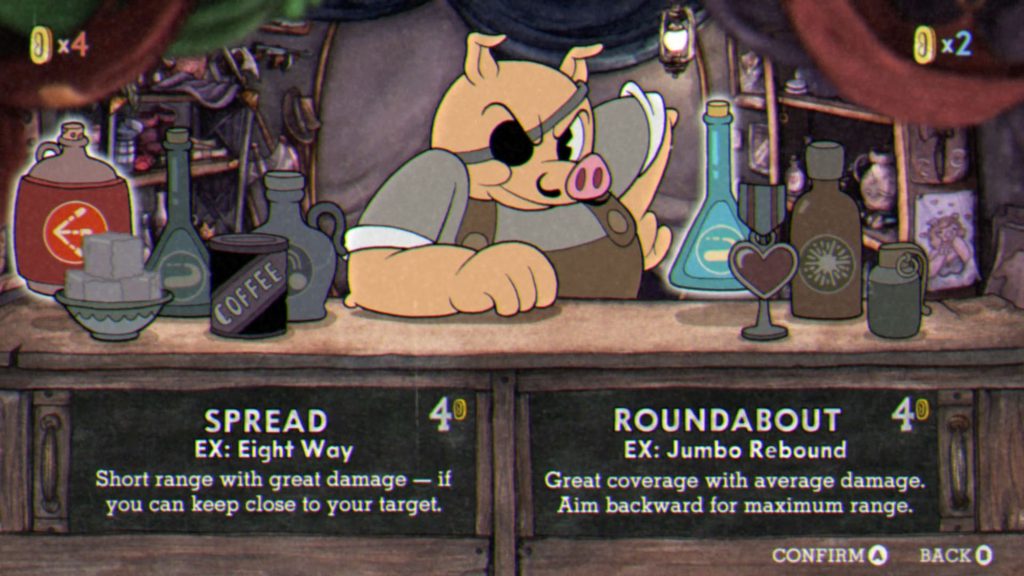 Antes de ingresar en cada nivel, tendremos que recorrer el mapa en el cual podremos acceder al shop para comprar -con monedas que recolectaremos en los escenarios- modificadores tales como shots, specials y charms, que nos podremos equipar y combinar como queramos para tratar de hacernos la vida un poquito más fácil, aunque realmente no lo consigamos del todo…