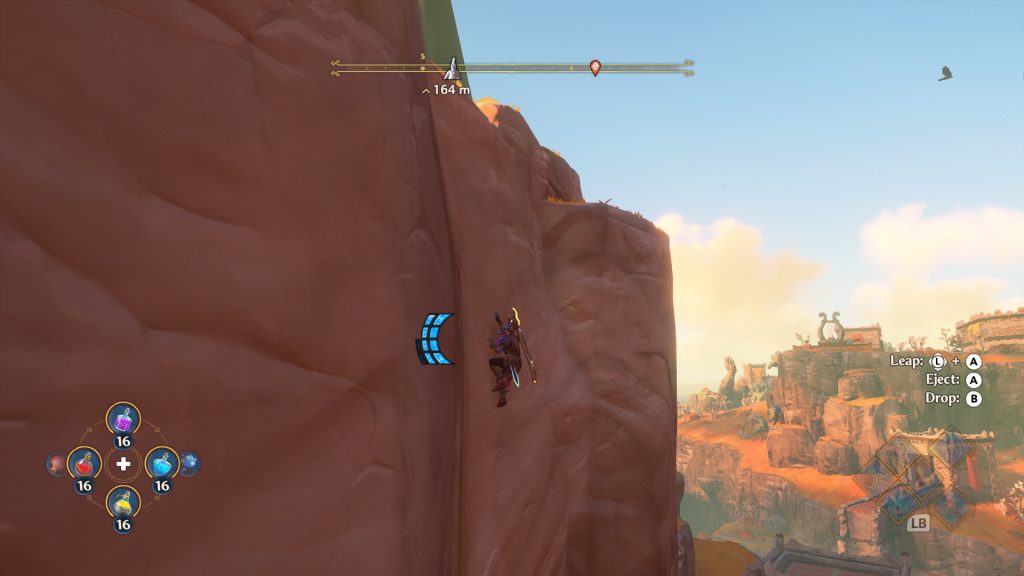 Quitemos de encima rápidamente las comparaciones superficiales. Si bien no jugué Breath of the Wild, lo he probado unas pocas horas y es, además, harto conocida su estética, navegación en el mundo y sistema de stamina. Fenyx Rising -para hacerlo más corto- toma estos elementos de una manera semi-calcada, esa es la verdad.