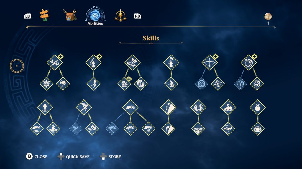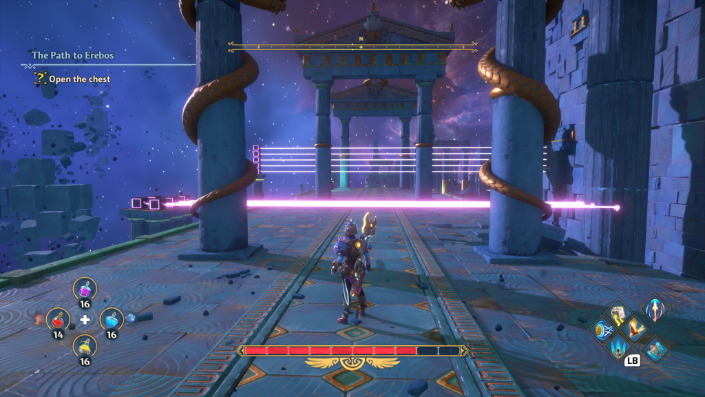 Luego de un prólogo -que funciona a manera de tutorial- de entre una y tres horas según el complecionismo del jugador, Hermes nos conducirá al hub central del título: el salón de los Dioses. Desde allí podremos iniciar cualquier travesía, ya sean objetivos principales de historia, secundarios o de obtención de recursos. En este mismo hub, podremos utilizar los elementos obtenidos para mejorar a nuestro personaje y sus habilidades.