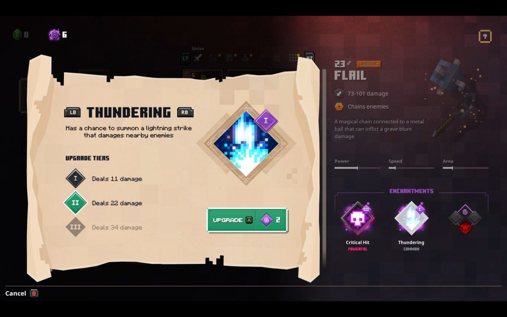 Los tres slots de equipamiento (dos armas y una armadura) pueden ser mejorados usando unos puntos de habilidad que conseguimos a medida que subimos de nivel. Cada arma o armadura viene con hasta tres slots para buffs pasivos; en cada slot, de forma aleatoria, se nos presenta a elección entre dos y tres buffs.