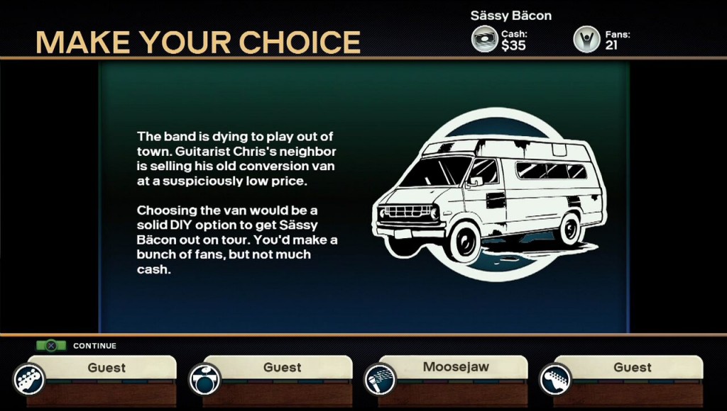 El último modo es donde se luce un poco más el juego, ya que a medida que avanzamos podemos elegir, por ejemplo, entre contratar a un nuevo manager, o comprar un nuevo transporte para las distintas giras. Mientras que uno te permite ganar más dinero, el otro te permite recorrer más locaciones y tener más fans. Podemos optar también por un diseñador de moda o un agente publicitario, son varias las opciones disponibles a medida que avanzamos.