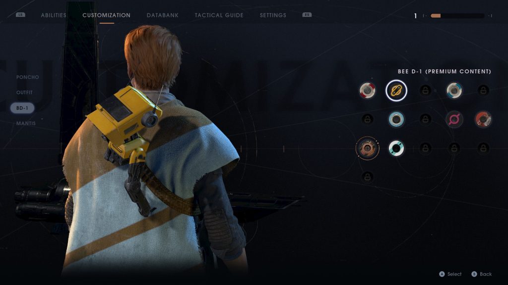 Cal por suerte no está solo, sino que lo acompaña el diminuto droide BD-1, que transpira carisma y funciona como integración entre mecánicas de juego e historia: ¿cuál es el nexo necesario para avanzar la historia? BD-1. ¿Qué necesito para atravesar esta parte del mapa? BD-1. ¿Cómo se puede curar Cal durante el combate? BD-1.  ¿Cuál va a ser el juguete mejor vendido esta navidad? BD-1.