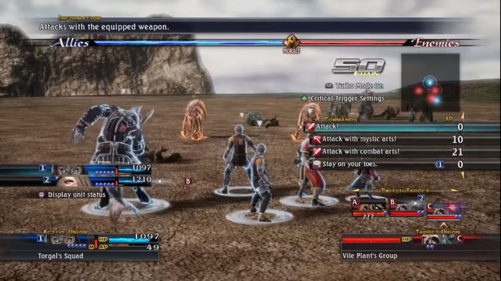 Lo que distingue a The Last Remnant es su sistema de combate por turnos, en el que controlamos pequeños grupos en lugar de individuos y los comandos disponibles dependen de factores como la posición relativa de los oponentes y los caprichos de nuestros personajes.